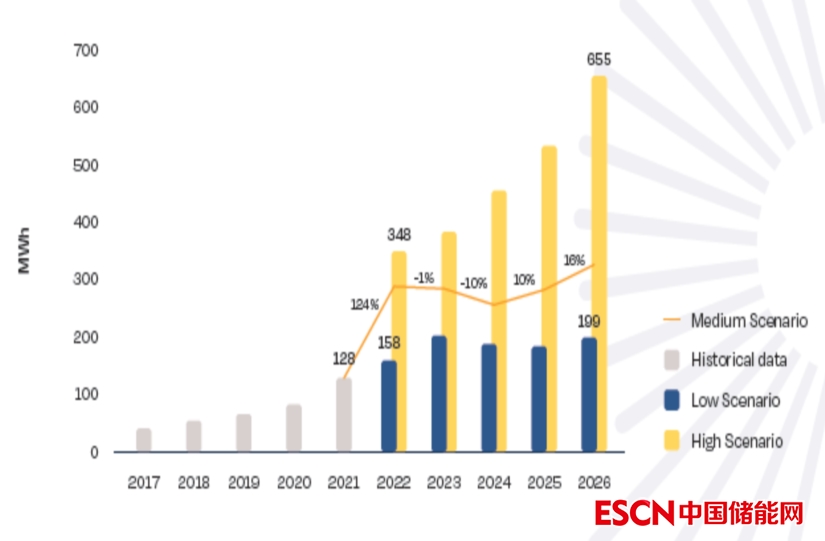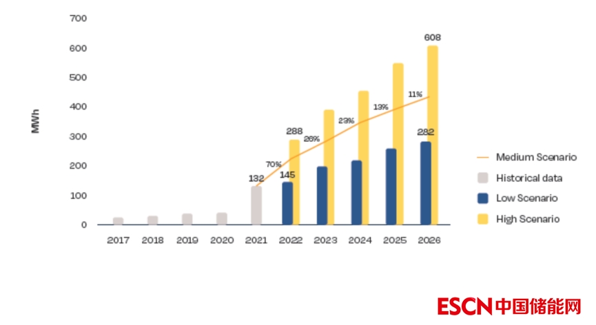 根據(jù)歐洲光伏產(chǎn)業(yè)協(xié)會(huì)進(jìn)行的“中等情景”預(yù)測(cè),隨著智能電表計(jì)劃在2024年完成,以及根據(jù)《可再生能源擴(kuò)張法案》(EAG)實(shí)施的投資計(jì)劃,預(yù)計(jì)奧地利在2022年部署的住宅電池儲(chǔ)能系統(tǒng)儲(chǔ)能容量將達(dá)到223MWh,同比增長(zhǎng)70%。隨著能源供應(yīng)市場(chǎng)不穩(wěn)定性的持續(xù),消費(fèi)者將越來(lái)越多地部署住宅太陽(yáng)能發(fā)電設(shè)施和住宅電池儲(chǔ)能系統(tǒng)。根據(jù) “中等情景”預(yù)測(cè),奧地利在未來(lái)四年住宅電池儲(chǔ)能市場(chǎng)年增長(zhǎng)率為11%~26%,與2022年相比,2026年將達(dá)到430MWh。然而在“高等情景”中,估計(jì)到2026年住宅電池儲(chǔ)能市場(chǎng)將增長(zhǎng)40%以上,將達(dá)到608MWh(見(jiàn)圖4.4)。