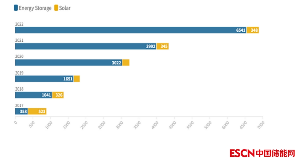 特斯拉公司2017~2022年部署儲(chǔ)能系統(tǒng)和太陽能發(fā)電設(shè)施的規(guī)模。太陽能以MW為單位,儲(chǔ)能系統(tǒng)以MWh為單位