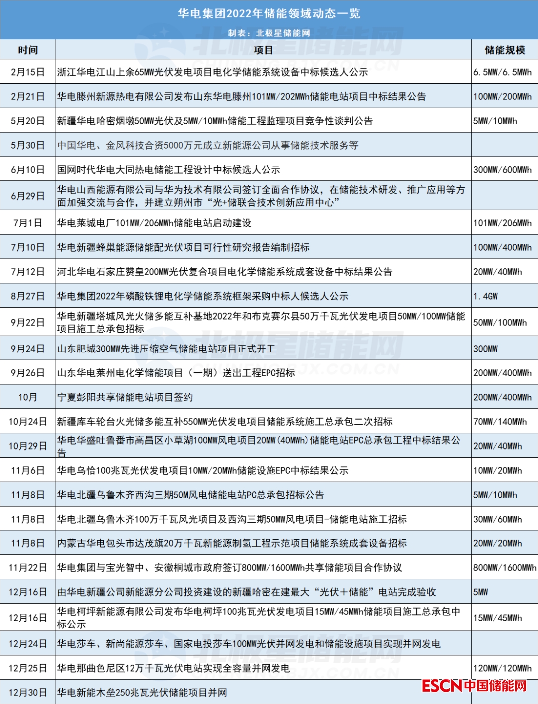 2022年,華電集團(tuán)儲能項目規(guī)模超2477MW/4417MWh。同華能情況相似,華電集團(tuán)在長時儲能方面也投資多個項目。例如華電集團(tuán)與蜂巢能源合作開發(fā)新疆儲能配光伏項目,2022年7月,該項目發(fā)布可行性研究報告編制公開競談項目公告。