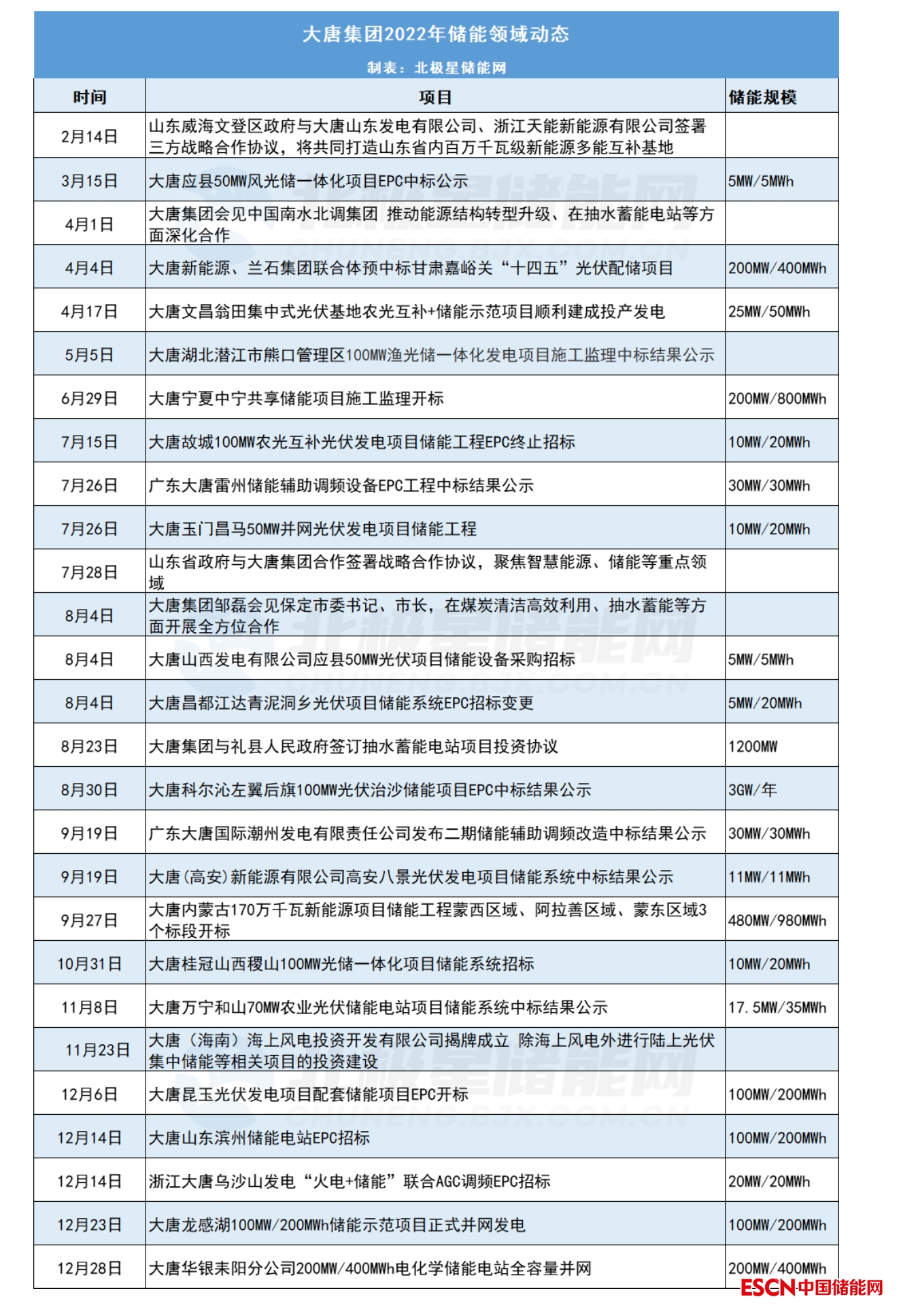 大唐集團(tuán)在上半年開啟一批儲能項目招標(biāo),擬建、在建項目規(guī)模超2758MW/3446MWh。這些項目在2022年12月末陸續(xù)并網(wǎng),值得關(guān)注的是,其中湖南、湖北兩個“最大”儲能項目并網(wǎng)。