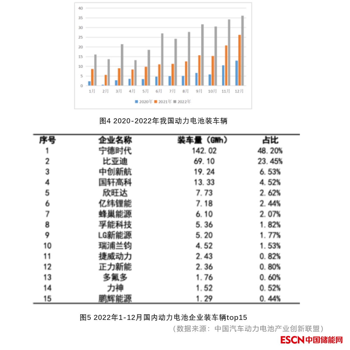裝車輛方面,2022年,我國動(dòng)力電池累計(jì)裝車輛達(dá)294.6GWh,同比增長90.7%。其中,三元電池及磷酸鐵鋰電池裝車輛分別為110.4GWh和183.8GWh,占總裝機(jī)量的37.5%及62.4%。動(dòng)力電池企業(yè)競爭方面,表現(xiàn)出明顯的龍頭效應(yīng)。2022年,我國新能源市場共計(jì)57家動(dòng)力電池企業(yè)實(shí)現(xiàn)裝車配套,排名前3家、前5家、前10家企業(yè)裝車輛分別占比78.2%、85.3%和95.0%。