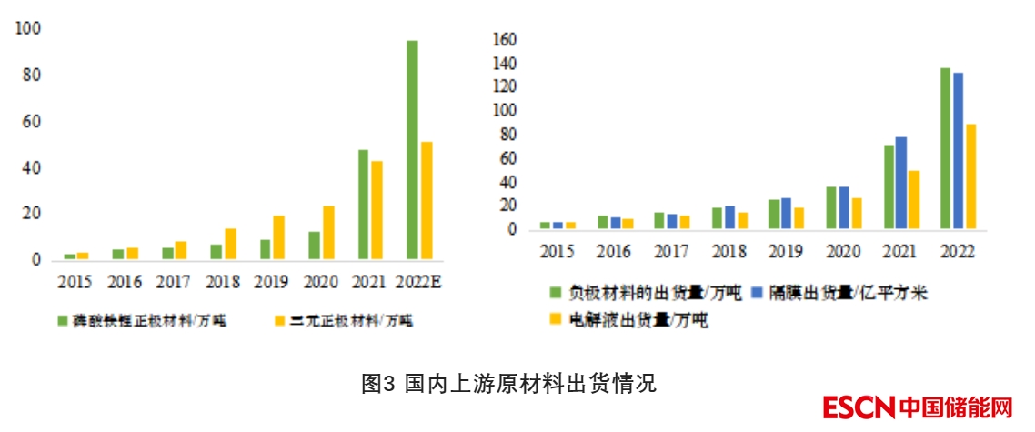 受益于中國新能源汽車產(chǎn)量及儲(chǔ)能市場的不斷增加,帶動(dòng)著國內(nèi)正極材料、負(fù)極材料、隔膜、電解液等產(chǎn)品的出貨量持續(xù)走高。2022年,磷酸鐵鋰正極材料的出貨量有望達(dá)到95萬噸,同比增長近1倍;三元正極材料出貨量或?qū)⑦_(dá)到51.2萬噸;負(fù)極材料出貨量約為137萬噸,同比增長90%;電解液出貨量或?qū)⑦_(dá)到89.1萬噸,同比增長75.7%,在全球的占比增加至85.4%;隔膜出貨量同比增長了65.3%,達(dá)到133.2億平米,其中濕法隔膜出貨量為104.8億平米。
