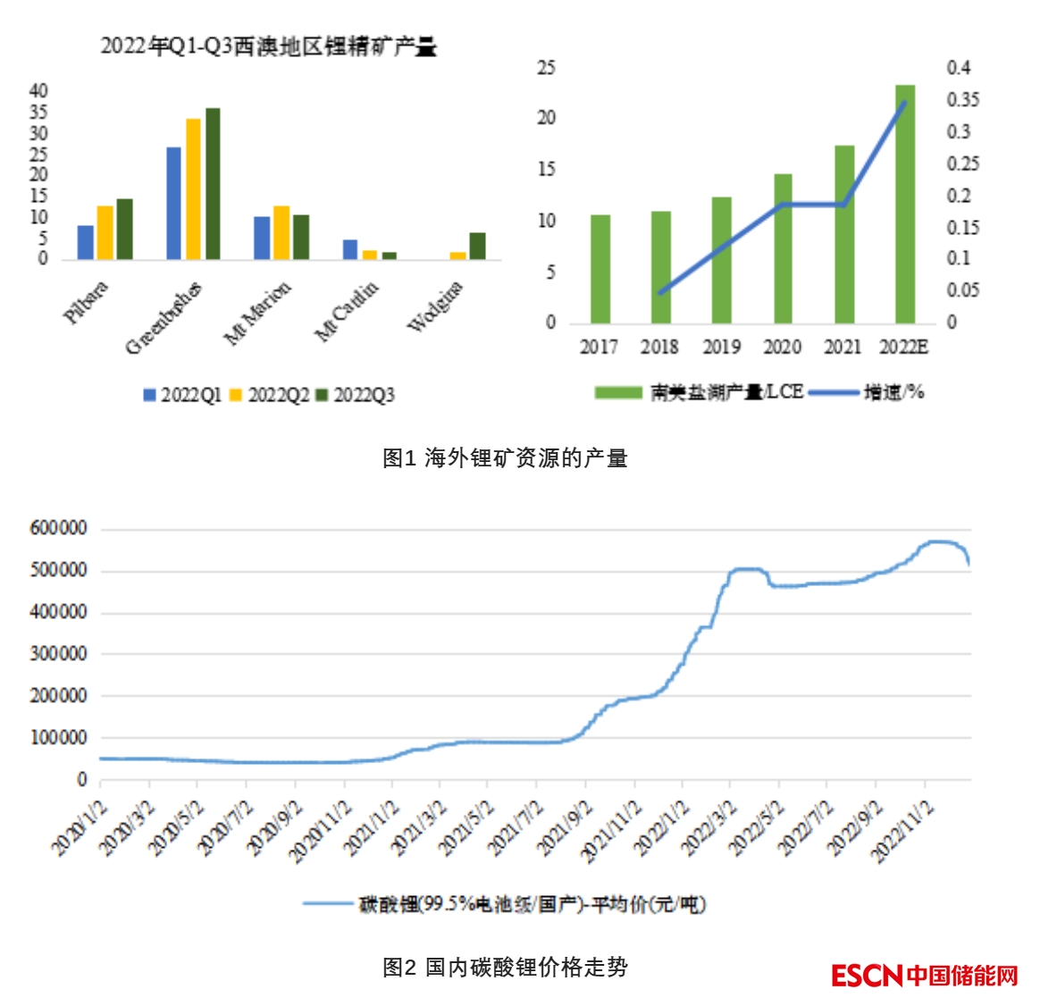 2022年,全球鋰礦供應(yīng)仍以成熟的澳洲鋰礦和在產(chǎn)的南美鹽湖項(xiàng)目為主,供應(yīng)量較2021年有所增加;但新增的產(chǎn)能釋放不及預(yù)期,僅西澳地區(qū)的Wodgina和Ngungaju項(xiàng)目復(fù)產(chǎn)以及智利的Atcama鹽湖項(xiàng)目擴(kuò)產(chǎn)貢獻(xiàn)大部分增量。鋰礦供應(yīng)邊際增量小幅上調(diào),但全球新能源產(chǎn)業(yè)的快速發(fā)展帶動(dòng)了需求量的持續(xù)增長,導(dǎo)致全球鋰資源整體的供應(yīng)壓力未減,導(dǎo)致年內(nèi)鋰礦的拍賣價(jià)格和鋰鹽的價(jià)格屢創(chuàng)新高,鋰精礦拍賣價(jià)格自四月份的5650美元/噸上漲至7805美元/噸,鋰鹽的價(jià)格也自2022年初的30萬元/噸上漲至近60萬元/噸。