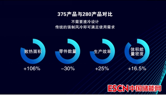 相比現(xiàn)有的280Ah產(chǎn)品,375Ah產(chǎn)品散熱面積提升了106%,無(wú)需液冷設(shè)計(jì),傳統(tǒng)的強(qiáng)制風(fēng)冷即可滿足使用需求;系統(tǒng)零件數(shù)量減少了30%,生產(chǎn)效率提升了25%,體積利用率增加了16.5%,40英尺集裝箱最高可容納7MWh,綜合總成本預(yù)期降低9%。