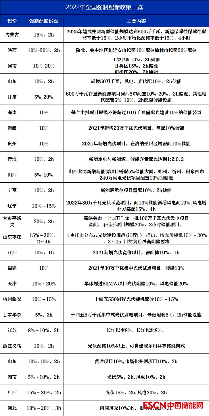 中國儲能網(wǎng)訊:根據(jù)各省下發(fā)的保障性并網(wǎng)、市場化并網(wǎng)新能源項(xiàng)目申報要求,配儲的最低比例如下表。實(shí)際上,在大多數(shù)省份,項(xiàng)目要想獲得規(guī)模指標(biāo),實(shí)際的配儲比例均高于下表。