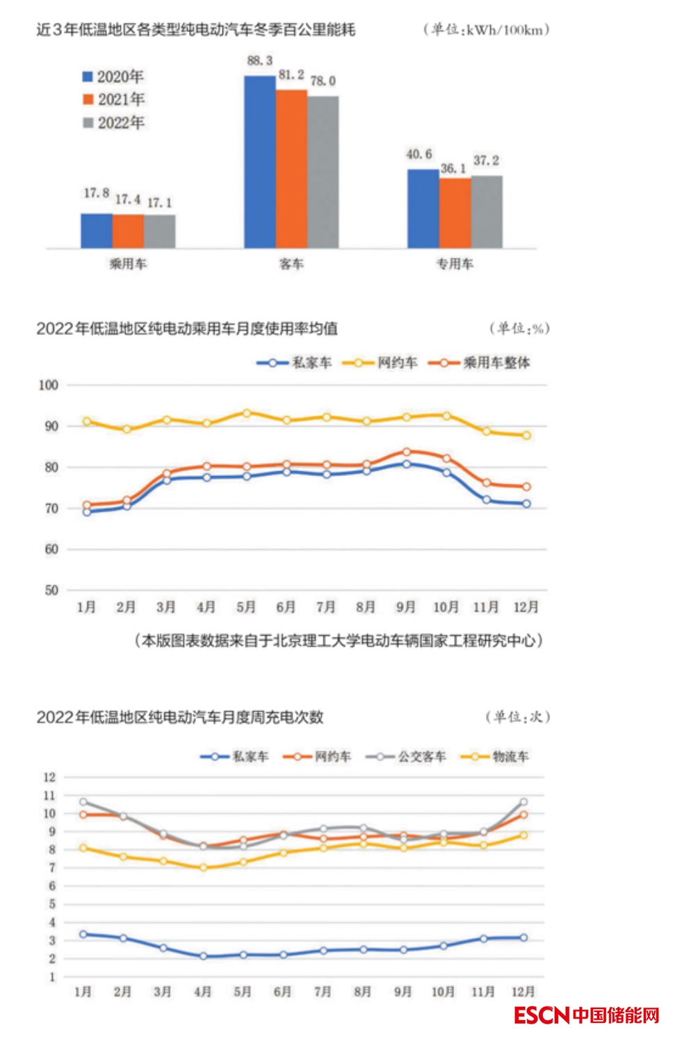 統(tǒng)計(jì)數(shù)據(jù)顯示,近3年來(lái),低溫地區(qū)純電動(dòng)汽車能耗總體呈下降趨勢(shì)。其中,純電動(dòng)乘用車和客車能耗降幅明顯,前者從2020年的17.8kWh/100km下降至2022年的17.1kWh/100km,后者從2020年的88.3kWh/100km下降至2022年的78kWh/100km。純電動(dòng)專用車的冬季平均能耗整體也在下降,但由于重型貨車推廣比例有所增加,所以2022年冬季能耗較2021年同期略有上升。