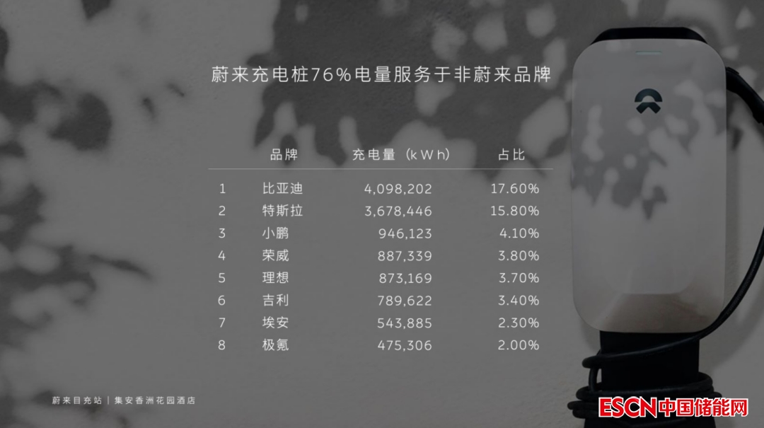 秦力洪介紹:“在春運(yùn)時段中,蔚來充電樁只有24%的電量在服務(wù)蔚來品牌車型,余下76%的電量則用來服務(wù)其他品牌車型。其中比亞迪充電量為4098202kWh,占比17.6%;特斯拉充電量3678446kWh,占比15.8%;小鵬充電量946123kWh,占比4.1%?!?