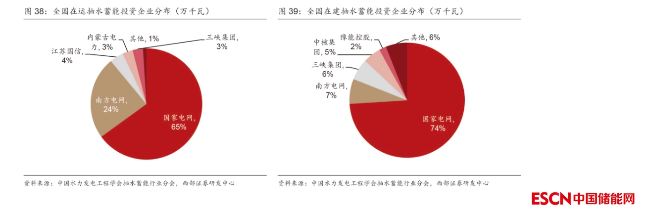 3)下游投資運營:主要企業(yè)有國網(wǎng)新源、南網(wǎng)雙調(diào),國網(wǎng)新源占據(jù)領(lǐng)先地位。截至 2021年底,國網(wǎng)新源公司在運和在建抽水蓄能規(guī)模分別為2351、4578萬kW,占比分別約64.6%和74.4%,在抽水蓄能開發(fā)建設(shè)及運營市場中占據(jù)絕對領(lǐng)導(dǎo)地位。中國抽水蓄能的建設(shè)企業(yè)主要有中國電建、中國能建所屬工程局。此外,中國安能、中國鐵建等企業(yè)也參與抽水蓄能電站部分地下工程建設(shè)。