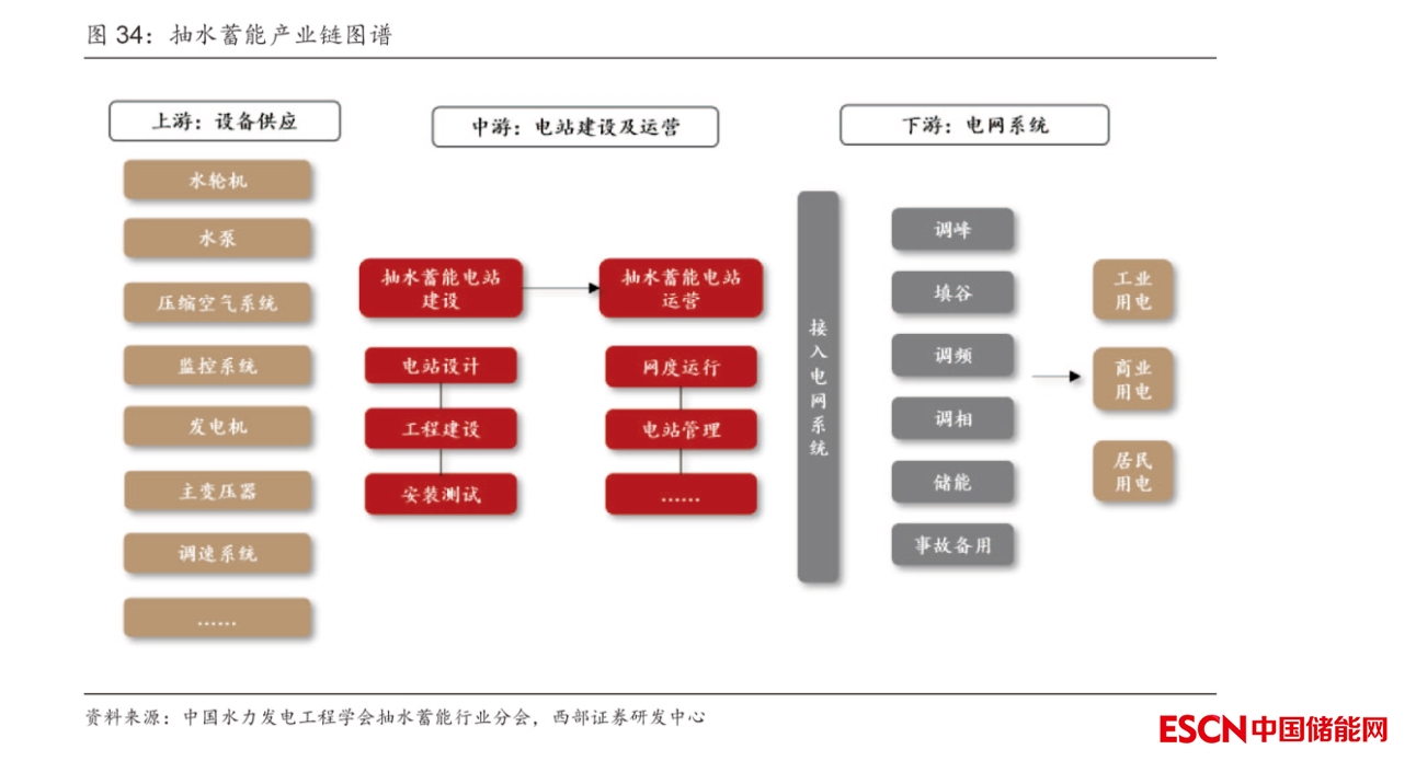 基本形成全產(chǎn)業(yè)鏈發(fā)展體系和專業(yè)化發(fā)展模式。通過大型抽水蓄能電站建設(shè)實踐,基本形成涵蓋標(biāo)準(zhǔn)制定、規(guī)劃設(shè)計、工程建設(shè)、裝備制造、運營維護的全產(chǎn)業(yè)鏈發(fā)展體系和專業(yè)化發(fā)展模式。上游主要為設(shè)備供應(yīng),包括水輪機、水泵、壓縮空氣系統(tǒng)、監(jiān)控系統(tǒng)、發(fā)電機、主變壓器、調(diào)速系統(tǒng)等;中游主要為建設(shè)工程,包括電站建設(shè)與電站運營兩個部分;下游主要服務(wù)于工業(yè)、商業(yè)以及居民用電,主要起到調(diào)峰、填谷、調(diào)頻、調(diào)相、儲能、事故備用等功能。