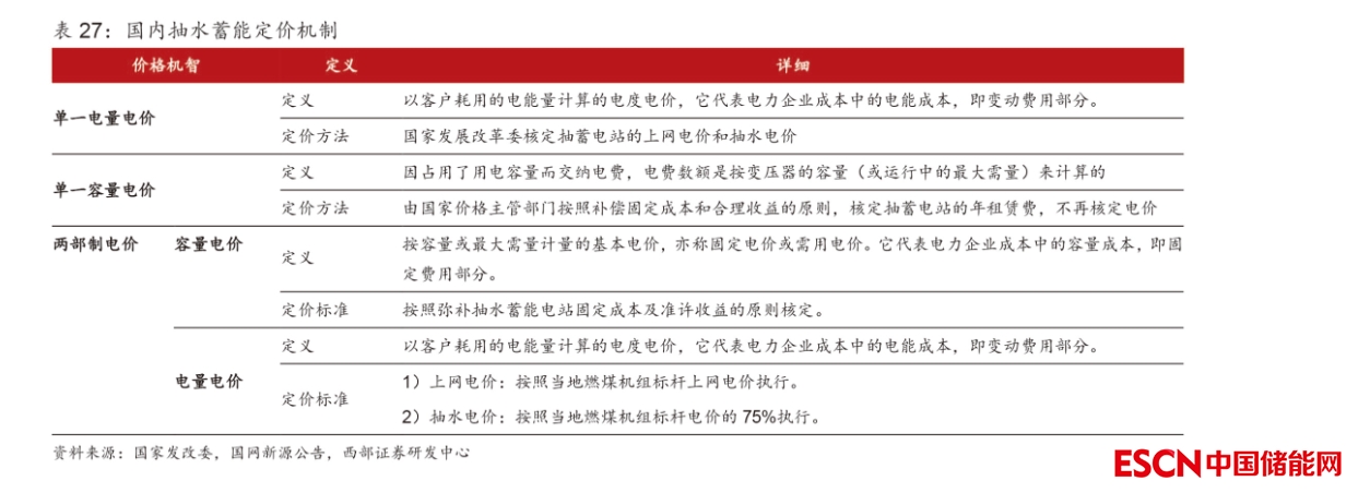 目前,我國抽水蓄能價格機制主要包括三種模式,即單一電量電價、單一容量電價、兩部制電價。1)單一電量電價多用于2004年以前投產(chǎn)的抽蓄電站,國家發(fā)展改革委核定抽蓄電站的上網(wǎng)電價和抽水電價;2)單一容量電價是應(yīng)用最普遍的機制,其計算出來的電費被稱為“基本電費”,是因占用了用電容量而交納的電費,電費數(shù)額是按變壓器的容量(或運行中的最大需量)來計算的,由國家價格主管部門按照補償固定成本和合理收益的原則,核定抽蓄電站的年租賃費,不再核定電價,租賃費一般由電網(wǎng)企業(yè)承擔(dān)50%,發(fā)電企業(yè)和用戶各承擔(dān)25%;3)兩部制電價在2014年被提出,把電價分為容量電價和電量電價兩部分。容量電價主要體現(xiàn)抽蓄電站提供調(diào)峰、調(diào)頻、調(diào)相和黑啟動等輔助服務(wù)價值,電量電價反應(yīng)的是企業(yè)的變動成本。