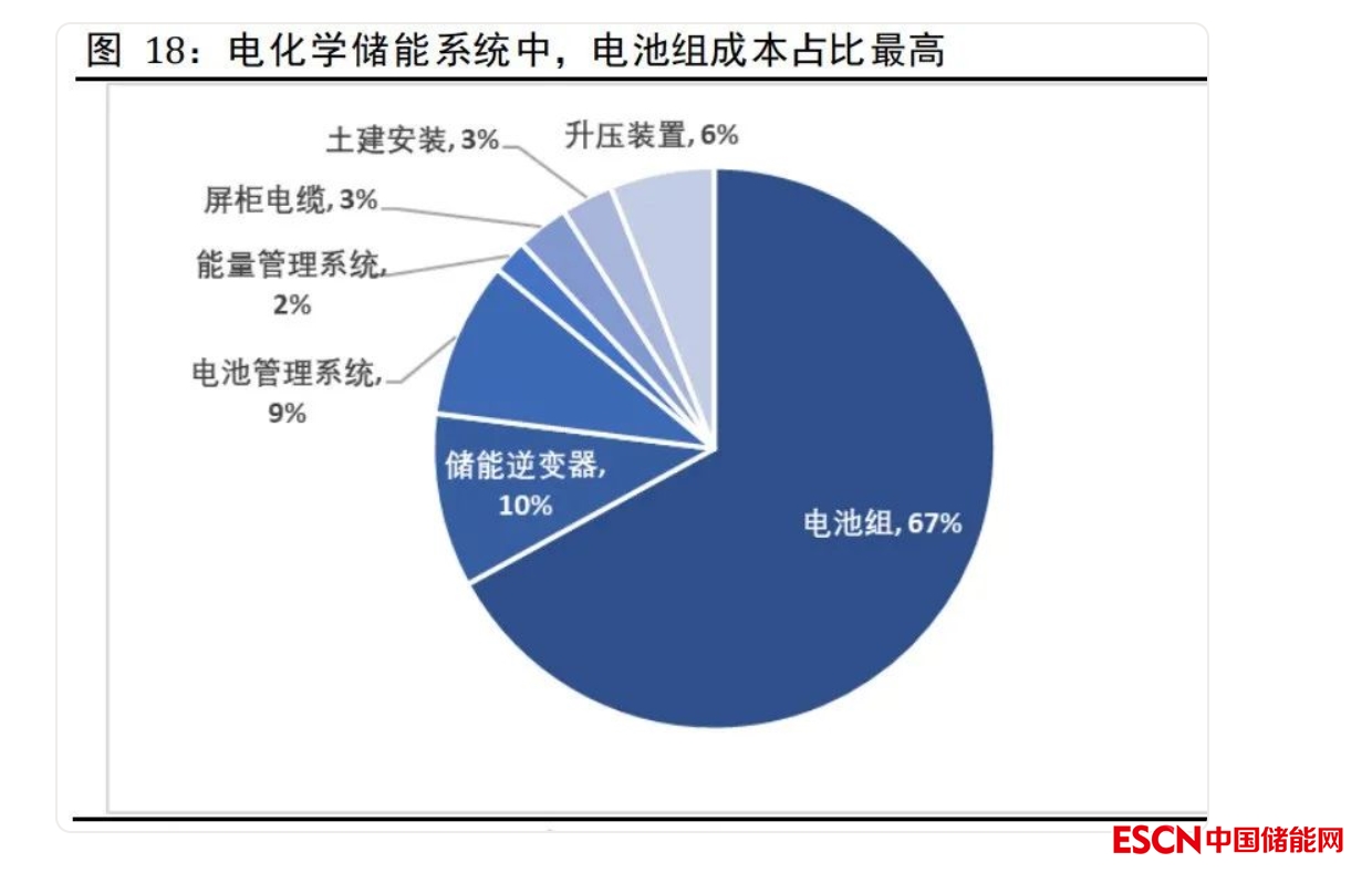 電池組成本是電化學(xué)儲能系統(tǒng)的主要成本,是未來產(chǎn)業(yè)鏈技術(shù)迭代和降成本的主要環(huán)節(jié)。根據(jù)高工鋰電數(shù)據(jù),一套完整的電化學(xué)儲能系統(tǒng)中,電池組成本占比最高達 67%,其次為儲能逆變器 10%,電池管理系統(tǒng)和能量管理系統(tǒng)分別占比 9%和 2%。