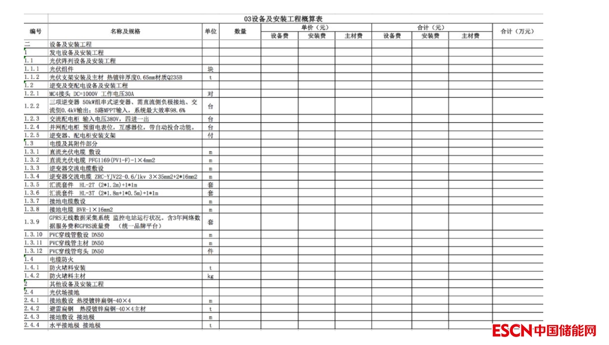 包含:發(fā)電設(shè)備(組件、逆變器、支架、電纜、接地)、升壓變電站設(shè)備、通信設(shè)備及其他設(shè)備的購買及安裝費用。如下表所示。(某電站的電氣設(shè)備項目附后)
