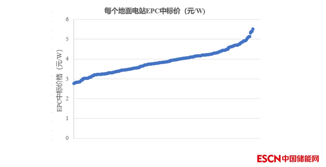 2022年1~12月,共追蹤了57.8GW大型地面光伏電站項目的EPC中標(biāo)價格,為2.8~5.5元/W之間,加權(quán)平均價格為3.791元/W。如下圖所示,圖中共有342個點,每個點代表1個光伏電站的中標(biāo)價格。