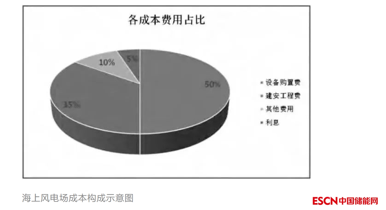 海上風(fēng)電場成本主要由以下幾個部分構(gòu)成:設(shè)備購置費、建安費用、其它費用、利息。各部分占總成本的比例不同,對總成本的影響也不盡相同。