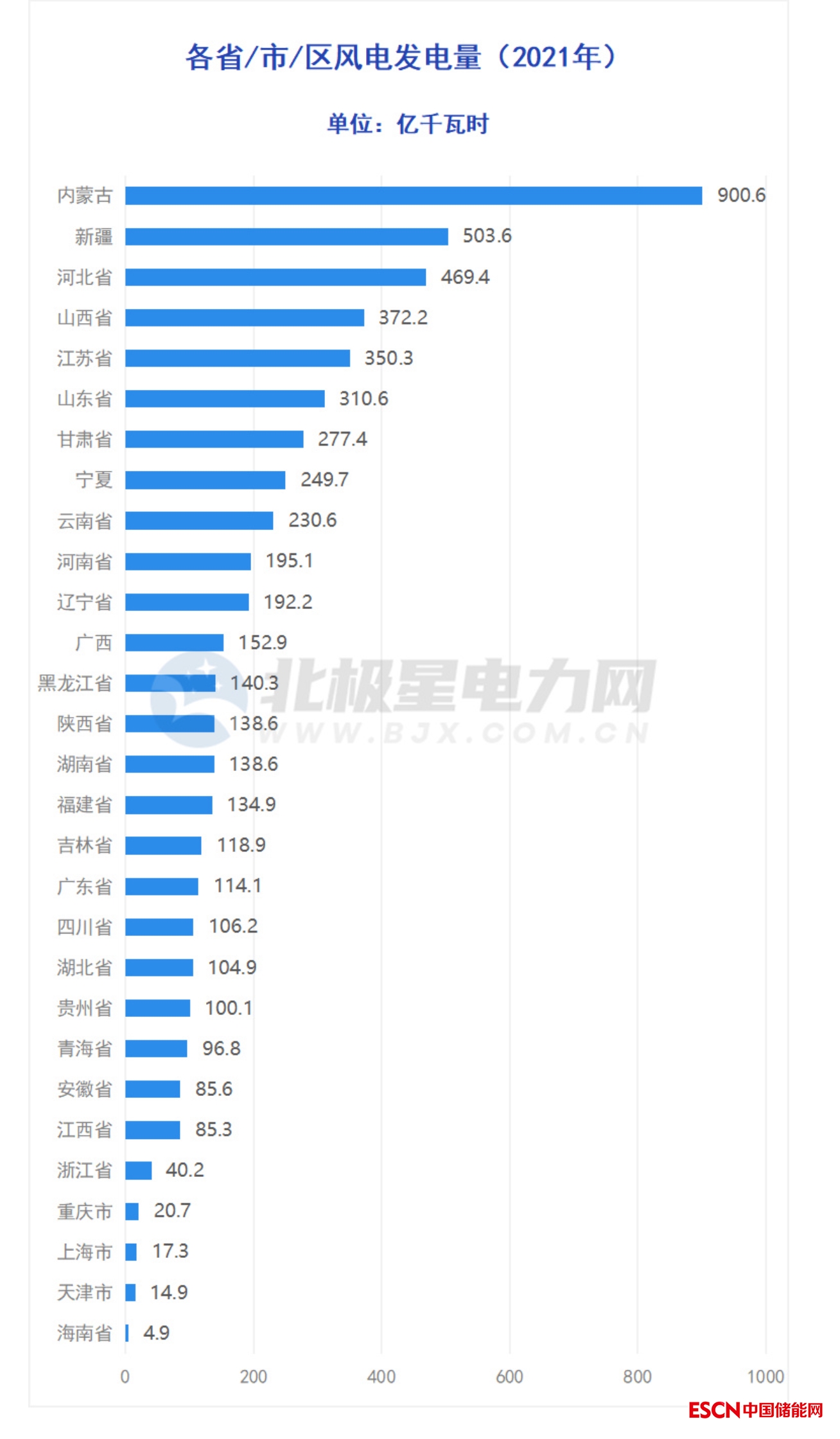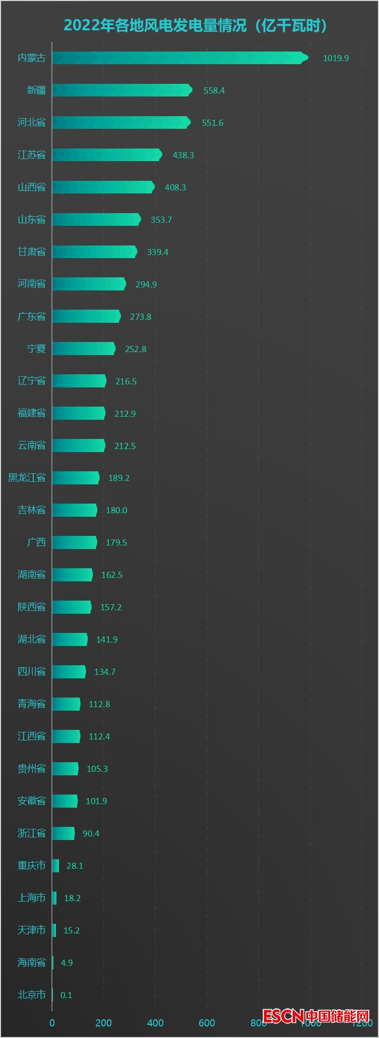 中國(guó)儲(chǔ)能網(wǎng)訊:2022年,風(fēng)電發(fā)電量排名TOP5的地方分別是:內(nèi)蒙古(1019.9億千瓦時(shí))、新疆(558.4億千瓦時(shí))、河北?。?51.6億千瓦時(shí))、江蘇?。?38.3億千瓦時(shí))、山西?。?08.3億千瓦時(shí))。