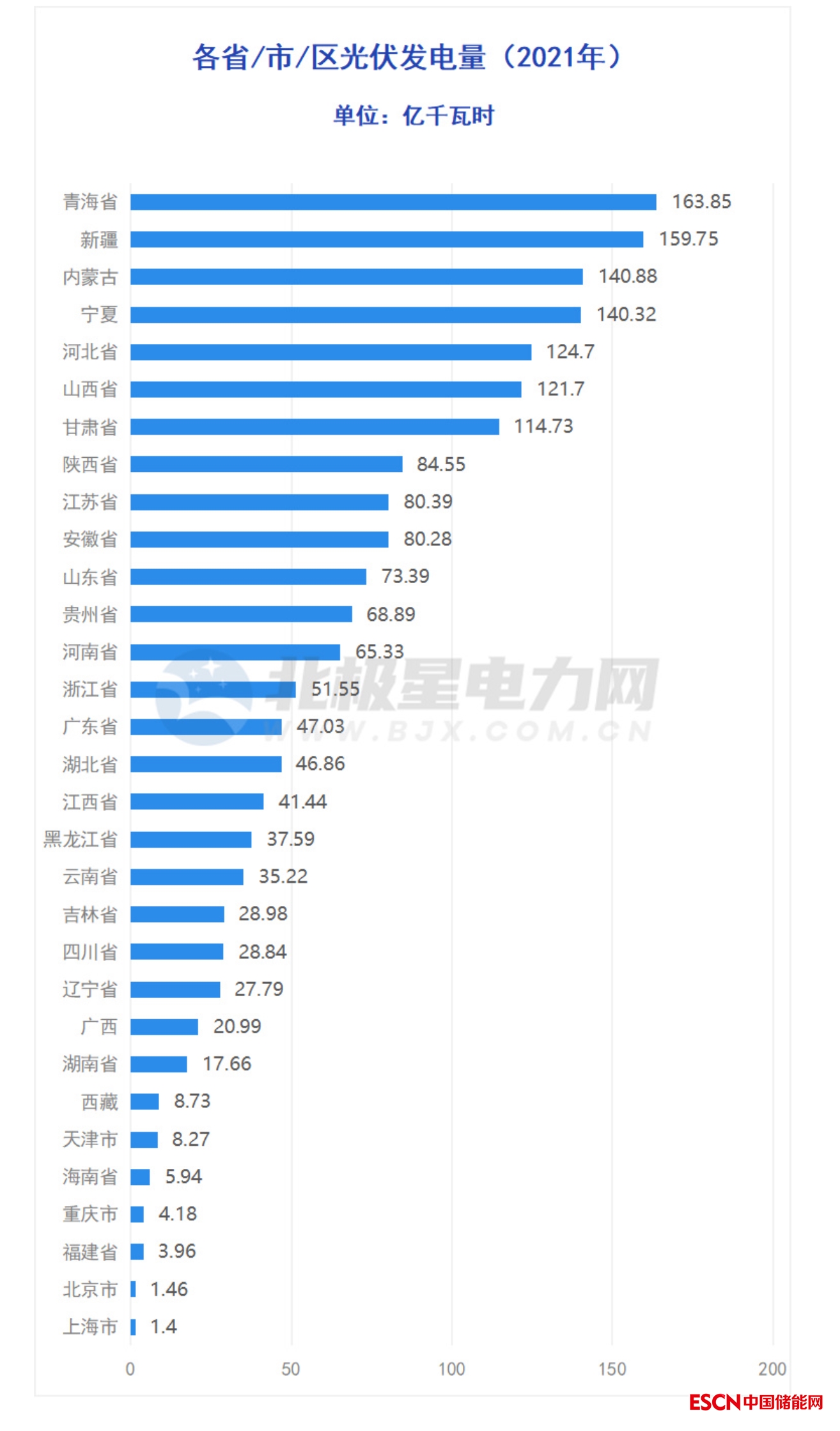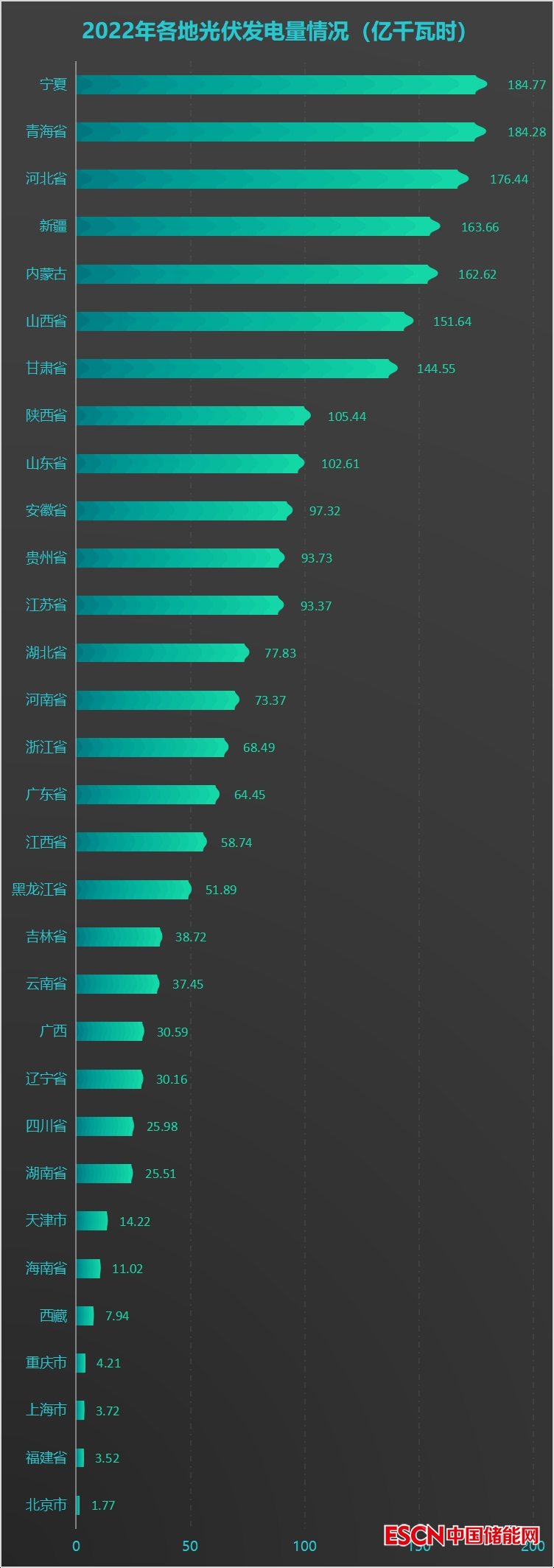 2022年,光伏發(fā)電量排名TOP5的地方分別是:寧夏(184.77億千瓦時(shí))、青海?。?84.28億千瓦時(shí))、河北?。?76.44億千瓦時(shí))、新疆(163.66億千瓦時(shí))、內(nèi)蒙古(162.62億千瓦時(shí))。