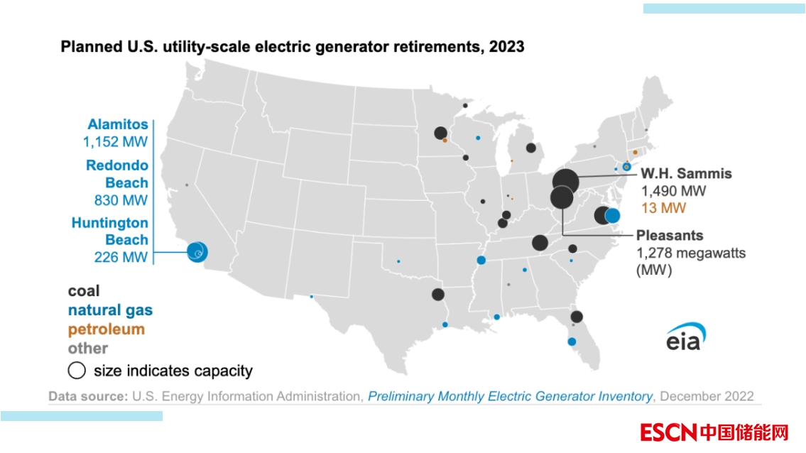 中國儲能網(wǎng)訊:根據(jù)美國能源信息署的數(shù)據(jù), 2023年美國電廠運營商計劃淘汰15.6吉瓦的發(fā)電裝機容量,其中大部分是天然氣電廠(6.2吉瓦)和燃煤電廠(8.9吉瓦)。