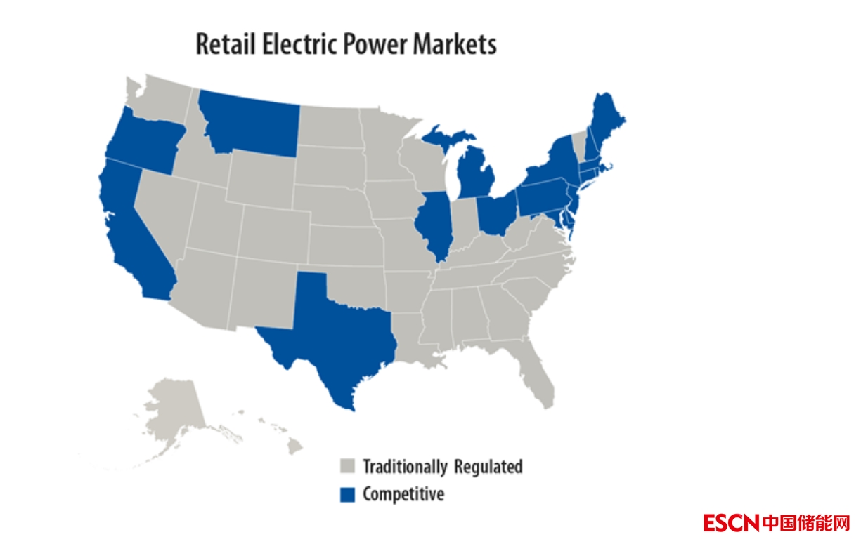 美國批發(fā)電力市場的某些部分傳統(tǒng)上受到監(jiān)管(灰色區(qū)域),這意味著垂直整合的公用事業(yè)公司負(fù)責(zé)向消費者提供的全部電力。他們擁有用于服務(wù)電力消費者的發(fā)電、輸電和配電系統(tǒng)。