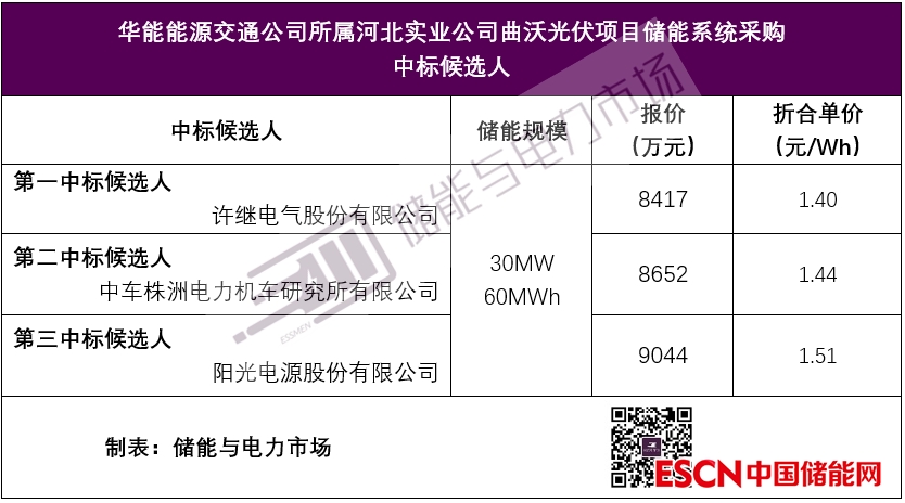 許繼電氣股份有限公司總報價8417萬元,折合單價1.4元/Wh,成為第一中標(biāo)候選人。