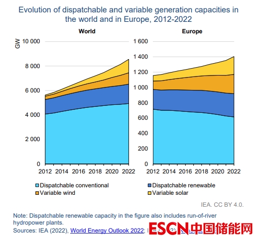 圖為2012-2022年全球(左)歐洲(右)可調(diào)度和可變發(fā)電能力的演變