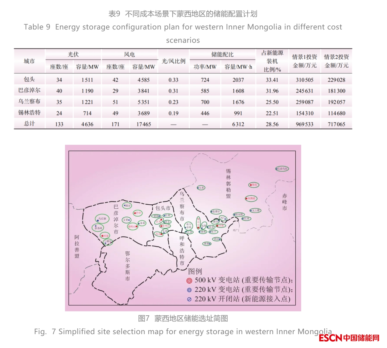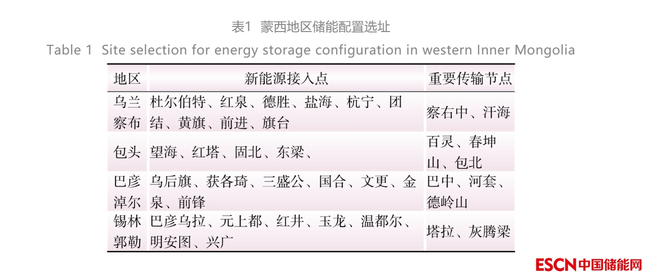對儲(chǔ)能的配置位置進(jìn)行合理規(guī)劃是降低儲(chǔ)能系統(tǒng)投資、提高運(yùn)行效益以及提升整個(gè)系統(tǒng)運(yùn)行穩(wěn)定性和資源利用效率的重要手段。文獻(xiàn)[24]提出了針對新能源側(cè)儲(chǔ)能選址優(yōu)化的通用性結(jié)論:在電力系統(tǒng)中的重要傳輸節(jié)點(diǎn)和可再生能源的發(fā)電接入點(diǎn)配置儲(chǔ)能可以在兼顧經(jīng)濟(jì)性和系統(tǒng)穩(wěn)定性的因素下達(dá)到儲(chǔ)能選址配置的最優(yōu)。因此,本文采用上述結(jié)論進(jìn)行蒙西地區(qū)儲(chǔ)能選址分析。以《內(nèi)蒙古電網(wǎng)2021年度運(yùn)行方式》提供的相關(guān)資料為參考依據(jù),蒙西地區(qū)的風(fēng)電、光伏資源主要集中在烏蘭察布、包頭、巴彥淖爾以及錫林浩特地區(qū),分別占蒙西地區(qū)新能源裝機(jī)容量的23.32%、21.63%、17.86%和15.62%。這些地區(qū)的重要傳輸結(jié)點(diǎn)以察右中、百靈、巴中、塔拉等500 kV變電站為主。在兼顧系統(tǒng)穩(wěn)定性及經(jīng)濟(jì)性因素下,重點(diǎn)在上述4個(gè)地區(qū)的新能源接入點(diǎn)和重要傳輸節(jié)點(diǎn)進(jìn)行儲(chǔ)能配置,具體選址如表1所示。其中,新能源接入點(diǎn)主要為220 kV變電站,重要傳輸節(jié)點(diǎn)為500 kV變電站,部分重要傳輸節(jié)點(diǎn)亦是新能源接入點(diǎn),不再重復(fù)列出。