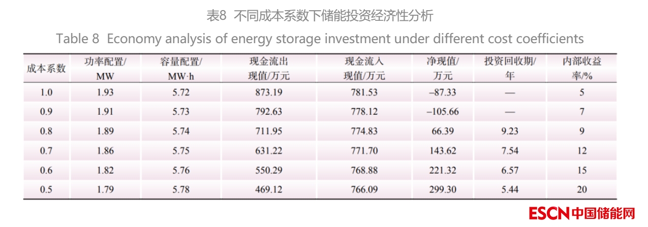 從表8可以看出,儲(chǔ)能的功率配置、容量配置和現(xiàn)金流入對于儲(chǔ)能的成本變化并不敏感,儲(chǔ)能成本的下降主要影響其初始投資成本,進(jìn)而影響凈現(xiàn)值、投資回收期以及內(nèi)部收益率等投資經(jīng)濟(jì)性指標(biāo)。成本系數(shù)為1時(shí),該項(xiàng)目的內(nèi)部收益率僅為5%,低于設(shè)定的8%的貼現(xiàn)率,不具有經(jīng)濟(jì)性,當(dāng)儲(chǔ)能成本下降20%時(shí),該項(xiàng)目的內(nèi)部收益率則增長到9%,初步具有投資經(jīng)性,而當(dāng)儲(chǔ)能成本下降50%時(shí),該項(xiàng)目的內(nèi)部收益率高達(dá)20%,具有良好的投資經(jīng)濟(jì)性。因此,儲(chǔ)能成本下降是提升儲(chǔ)能大規(guī)模配置積極性的重要影響因素。