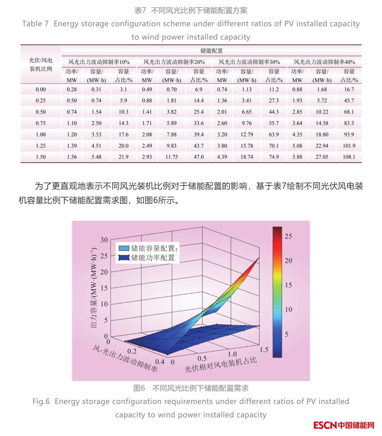 以10 MW的風(fēng)電裝機(jī)為標(biāo)準(zhǔn),光伏裝機(jī)容量占風(fēng)電裝機(jī)容量占比變化從0到1.5,風(fēng)光出力波動(dòng)性抑制率從10%增長到40%情況下,儲(chǔ)能系統(tǒng)的配置情況如表7所示。