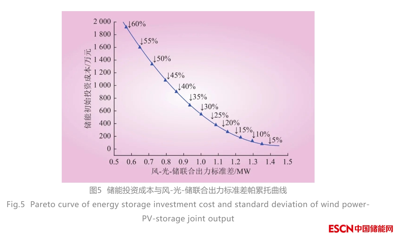 投資成本是儲(chǔ)能規(guī)劃設(shè)計(jì)的一項(xiàng)重要經(jīng)濟(jì)性指標(biāo),基于技術(shù)、經(jīng)濟(jì)性優(yōu)化結(jié)果可得到儲(chǔ)能系統(tǒng)投資成本與風(fēng)-光-儲(chǔ)聯(lián)合出力標(biāo)準(zhǔn)差之間的帕累托曲線,如圖5所示。隨著風(fēng)光出力波動(dòng)抑制率的不斷提高,儲(chǔ)能的初始投資成本不斷提高,且提高速率逐漸增加。風(fēng)光出力波動(dòng)抑制率從5%提升到35%,儲(chǔ)能的初始投資成本僅增加658.61萬,而從35%提升到60%,儲(chǔ)能的初始投資成本增加1 213.02萬元,為滿足更高的風(fēng)光出力的技術(shù)性要求需要投入的儲(chǔ)能成本將顯著提升。