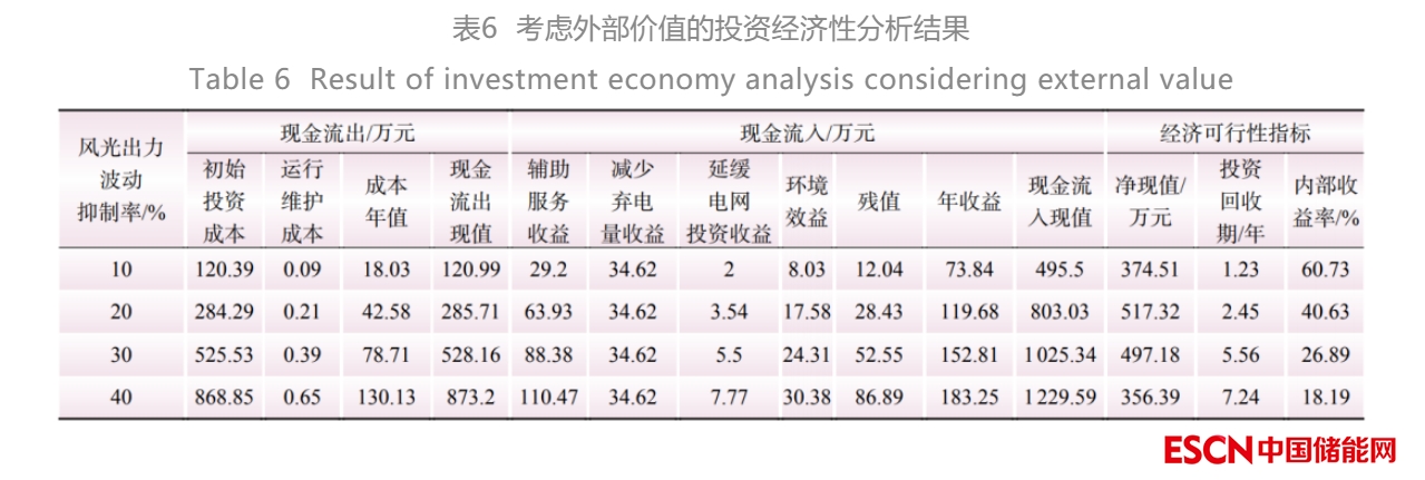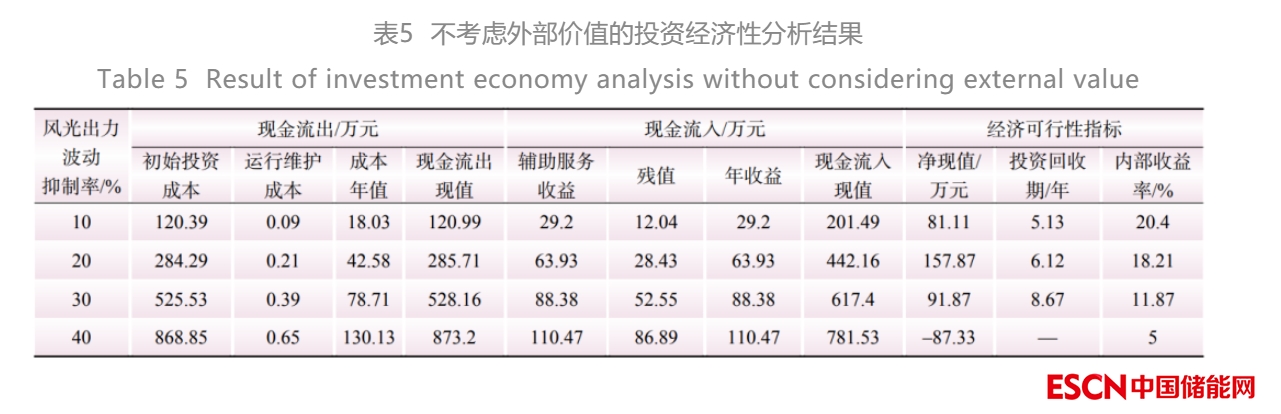 在不考慮儲(chǔ)能外部價(jià)值的情況下,該儲(chǔ)能項(xiàng)目投資經(jīng)濟(jì)性分析結(jié)果如表5所示。為了更加全面地反映經(jīng)濟(jì)性評價(jià)結(jié)果,表中加入投資回收期與內(nèi)部收益率的測算分析。隨著風(fēng)光出力波動(dòng)抑制率的逐漸提高,儲(chǔ)能的凈現(xiàn)值、內(nèi)部收益率逐漸下降,投資回收期逐漸提高,投資經(jīng)濟(jì)性呈下降趨勢。當(dāng) σp 大于30%時(shí),儲(chǔ)能系統(tǒng)的投資將不具有經(jīng)濟(jì)性,在規(guī)定壽命周期內(nèi)無法回收成本。