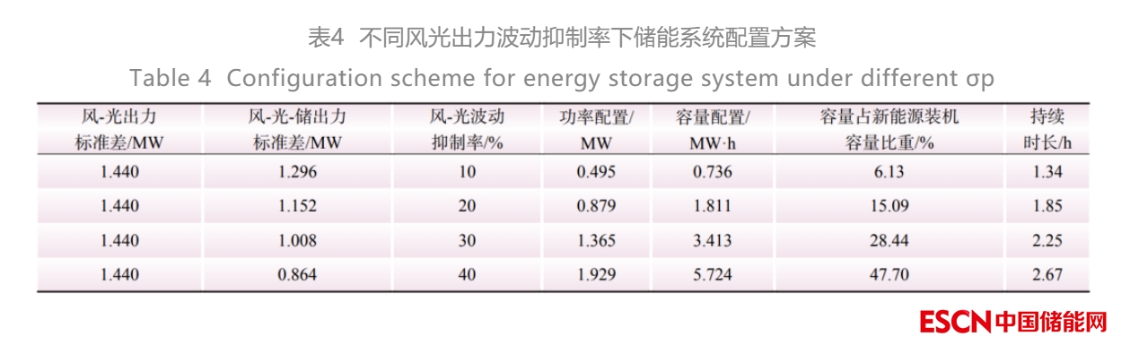 隨著風(fēng)光出力波動(dòng)抑制率要求的提高,儲(chǔ)能的功率、容量配置以及持續(xù)時(shí)長將快速增長。將風(fēng)光出力的標(biāo)準(zhǔn)差降低10%最少需要配置0.495 MW/0.736 MW·h的儲(chǔ)能,儲(chǔ)能占新能源裝機(jī)容量占比僅為6.13%,持續(xù)時(shí)間為1.34 h;而將風(fēng)光出力的標(biāo)準(zhǔn)差降低40%,則至少需要配置1.929 MW/5.724 MW·h的儲(chǔ)能,儲(chǔ)能占新能源裝機(jī)容量占比將提升到47.7%,持續(xù)時(shí)間需要提升到2.67 h。