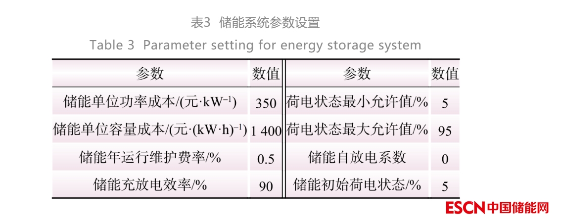 基于該地區(qū)的實(shí)際特點(diǎn),擬在節(jié)點(diǎn)A處配置鋰離子儲(chǔ)能系統(tǒng),主要為新能源發(fā)電端提供輔助服務(wù),因此該儲(chǔ)能系統(tǒng)對于發(fā)電端的影響為內(nèi)部價(jià)值,對于電網(wǎng)、用戶及環(huán)境的影響為外部價(jià)值。該儲(chǔ)能系統(tǒng)壽命為10年,容量衰減系數(shù)定為常數(shù)1,期末回收殘值率為10%。儲(chǔ)能的成本及效益計(jì)算采用凈年值計(jì)算方式,貼現(xiàn)率為8%。根據(jù)《華北電力調(diào)峰輔助服務(wù)市場運(yùn)營規(guī)則》,儲(chǔ)能系統(tǒng)提供輔助服務(wù)的成本為0.4元/(kW·h)。儲(chǔ)能系統(tǒng)的其他參數(shù)設(shè)置如表3所示。