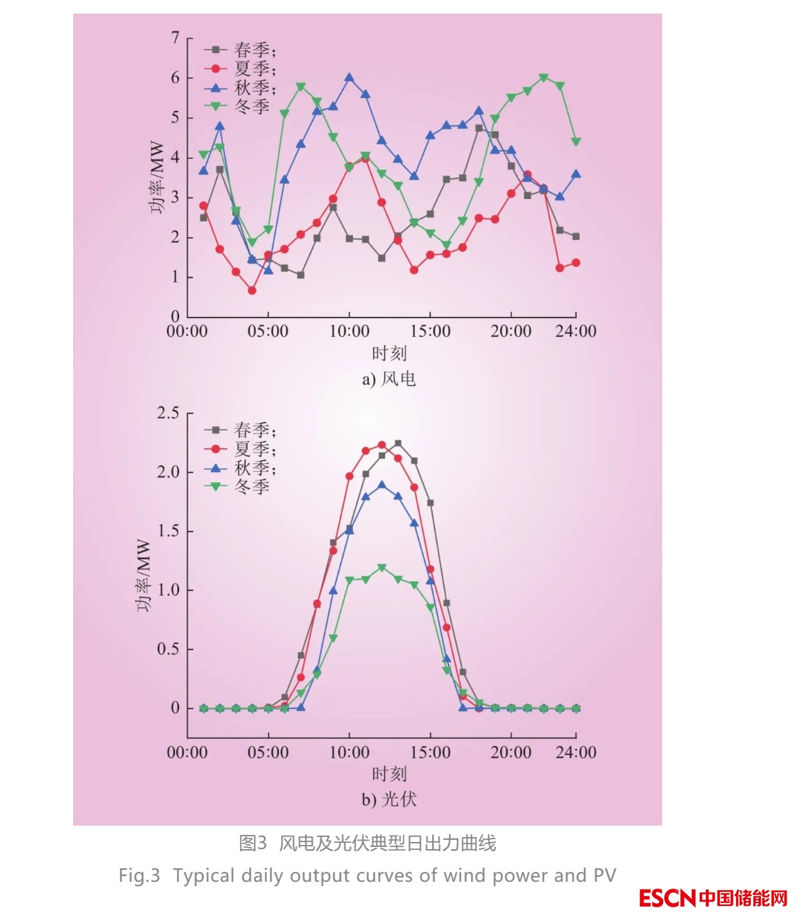 該地區(qū)的新能源由裝機(jī)容量為10 MW的風(fēng)電站和2.5 MW的光伏發(fā)電站構(gòu)成,能統(tǒng)一接入節(jié)點(diǎn)A。以季節(jié)變化為周期,該地區(qū)風(fēng)、光的典型日出力曲線如圖3所示。根據(jù)國家《國家發(fā)展改革委關(guān)于2021年新能源上網(wǎng)電價(jià)政策有關(guān)事項(xiàng)的通知》,蒙西地區(qū)風(fēng)電、光伏的上網(wǎng)電價(jià)為0.278 5元/(kW·h)。