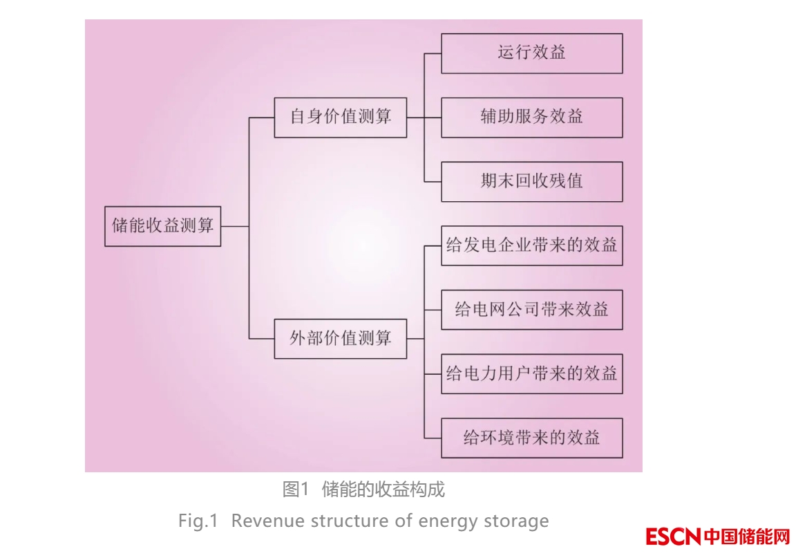 (2)儲(chǔ)能收益。儲(chǔ)能的收益測算主要包括自身價(jià)值測算和外部價(jià)值測算。其收益構(gòu)成如圖1所示。