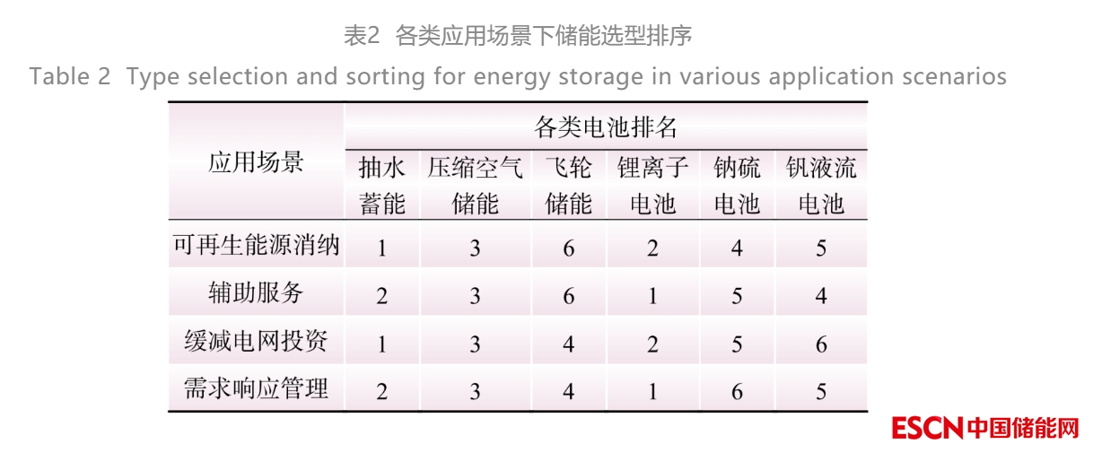 文獻(xiàn)[24]從技術(shù)、經(jīng)濟(jì)、效率、環(huán)境4個(gè)維度建立了適應(yīng)各種場景的儲(chǔ)能選型指標(biāo)體系,通過貝葉斯最優(yōu)最劣法確定了不同場景下的指標(biāo)權(quán)重,并通過模糊前景理論對儲(chǔ)能在各種場景下的選型進(jìn)行了綜合評價(jià),進(jìn)而得出了儲(chǔ)能在各類應(yīng)用場景的排序,如表2所示。該選型排序研究并未涉及與地區(qū)相關(guān)的因素,具有一定的通用性,因此本文采用該選型排序結(jié)論確定蒙西地區(qū)儲(chǔ)能類型。