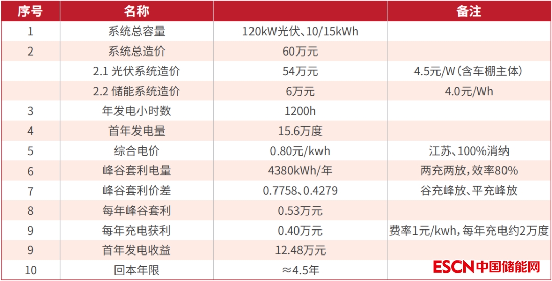 車棚120kW光伏、10/15kWh儲能整體測算: