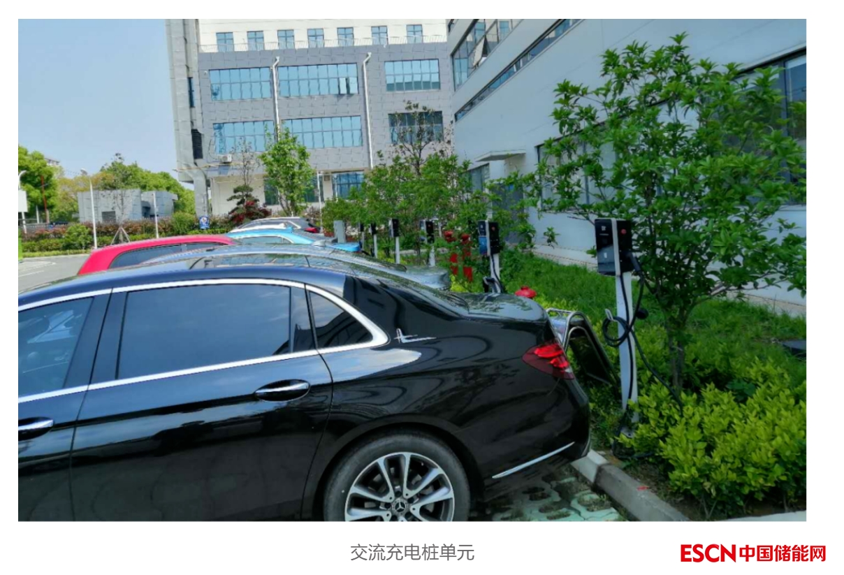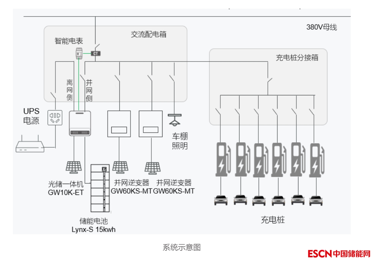 整個車棚包括120kW的光伏、10kW/15kWh的儲能示范及1個60kW直流充電樁、5個7kW交流充電樁,如下圖所示。
