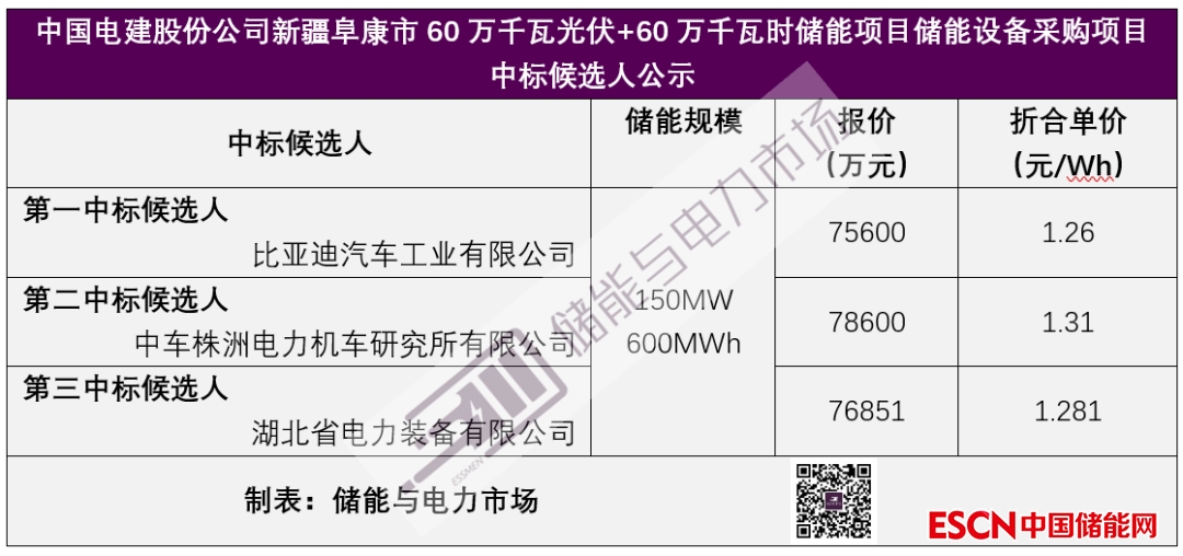 該項目儲能規(guī)模150MW/600MWh,比亞迪以總報價75600萬元,折合單價1.26元/Wh,成為第一中標(biāo)候選人。