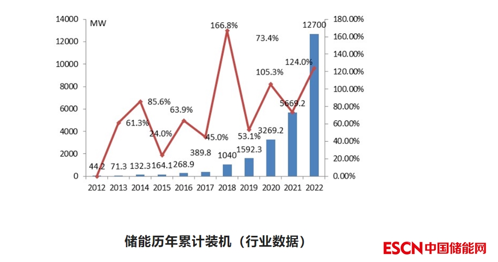 根據(jù)中關村儲能聯(lián)盟數(shù)據(jù),2021年底儲能總裝機約5.7GW(比官方數(shù)據(jù)高出40%),當年新增2.4GW/4.9GWh。而2022年初步批露的行業(yè)數(shù)據(jù)為總裝機12.7GW,當年新增6.9GW,仍比官方數(shù)據(jù)高出40%以上。