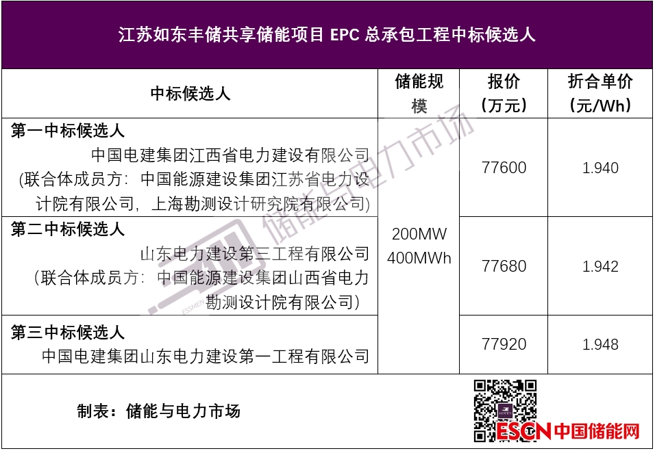 中國電建集團(tuán)江西省電力建設(shè)有限公司(聯(lián)合體成員方:中國能源建設(shè)集團(tuán)江蘇省電力設(shè)計(jì)院有限公司,上海勘測(cè)設(shè)計(jì)研究院有限公司)以總報(bào)價(jià)77600萬元,折合單價(jià)1.94元/Wh,成為第一中標(biāo)候選人。
