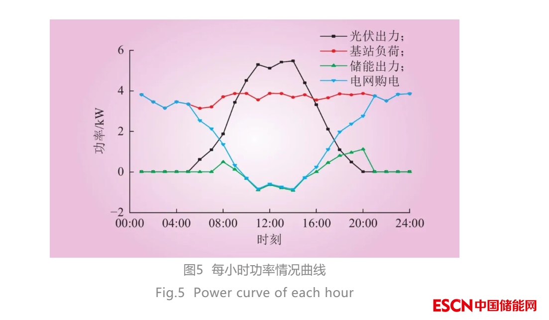 由圖5可以看出,00:00—05:00和23:00—24:00時(shí)段光伏發(fā)電出力為0,電網(wǎng)購(gòu)電量等于基站能耗;05:00—07:00時(shí)段光伏設(shè)備開(kāi)始發(fā)電,光伏出力小于基站能耗,系統(tǒng)從電網(wǎng)購(gòu)電,電網(wǎng)購(gòu)電量等于基站能耗減去光伏出力;07:00—09:00時(shí)段光伏出力小于基站能耗,系統(tǒng)仍從電網(wǎng)購(gòu)電,此時(shí)處于電價(jià)高峰時(shí)段,儲(chǔ)能放電來(lái)減少一定的購(gòu)電成本,電網(wǎng)購(gòu)電量等于基站能耗減去光伏出力和儲(chǔ)能放電量之和;09:00—16:00時(shí)段光伏出力大于基站能耗,儲(chǔ)能充電,光伏在滿足基站能耗和儲(chǔ)能充電量后的多余出力向電網(wǎng)售電;16:00—19:00時(shí)段電價(jià)處于高峰時(shí)段,光伏出力小于基站能耗,儲(chǔ)能放電為基站提供部分電量,電網(wǎng)購(gòu)電量等于基站能耗減去光伏出力與儲(chǔ)能放電量之和;19:00—20:00時(shí)段光伏發(fā)電出力為0,電價(jià)仍處于高峰時(shí)段,儲(chǔ)能放電,但放電量小于基站能耗,系統(tǒng)需從電網(wǎng)購(gòu)電;20:00—23:00時(shí)段光伏發(fā)電出力為0,分時(shí)電價(jià)處于平時(shí)段,儲(chǔ)能不工作,電網(wǎng)購(gòu)電量等于基站能耗。