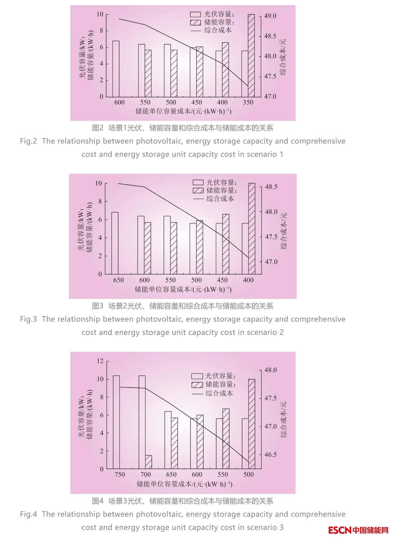 為了探究系統(tǒng)經(jīng)濟(jì)效益與儲(chǔ)能成本的關(guān)系,假設(shè)儲(chǔ)能單位容量安裝投資費(fèi)用逐漸下降,其余數(shù)據(jù)均保持不變,分析3種場(chǎng)景下光伏、儲(chǔ)能容量和系統(tǒng)綜合成本隨儲(chǔ)能成本變化,結(jié)果分別如圖2、圖3、圖4所示。