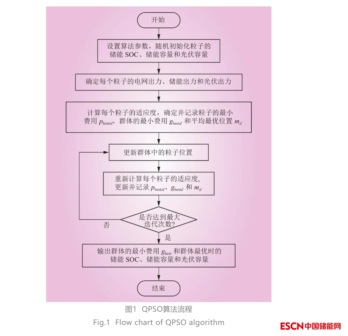 對(duì)于本文的優(yōu)化問(wèn)題,采用QPSO算法進(jìn)行求解,粒子群體大小N為5889,維數(shù)d為25,目標(biāo)函數(shù)為適應(yīng)度函數(shù)。在滿足約束條件的情況下,求得5G基站光儲(chǔ)系統(tǒng)的綜合成本費(fèi)用最小值,并可以確定光伏和儲(chǔ)能的最佳接入容量。求解流程如圖1所示。