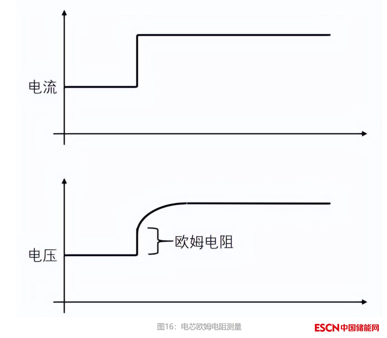 此外,SOH值和內(nèi)部阻抗值存在一定的關(guān)系,可以通過測(cè)試內(nèi)部阻抗來估算SOH值。我們可以用線性最小二乘法擬合一系列電壓和電流有序?qū)?,從而獲得相對(duì)比較精確的直流歐姆阻抗估測(cè)值。利用最小二乘法得出的回歸線的斜度等于阻抗,而回歸線的截距則代表非IR電壓值。此外,檢測(cè)電流的階躍變化近似值,還可以測(cè)量相應(yīng)的瞬時(shí)電壓變化。DeltaV/DeltaI的比值可用于計(jì)算該處的歐姆電阻,如圖16所示。