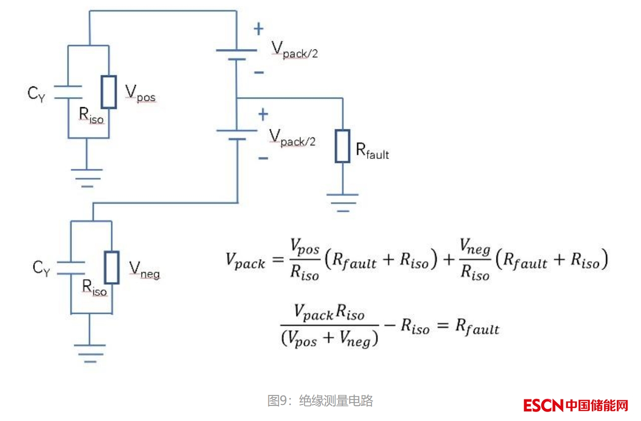 在儲(chǔ)能系統(tǒng)中,電池插箱等帶有絕緣高壓元件與接地/箱體接地之間存在寄生電容和電導(dǎo)。這些寄生元件需要進(jìn)行特別的考慮。因此電池管理系統(tǒng)中應(yīng)該加入離線或在線的絕緣檢測(cè)電路。圖9簡(jiǎn)單介紹一個(gè)絕緣檢測(cè)電路。