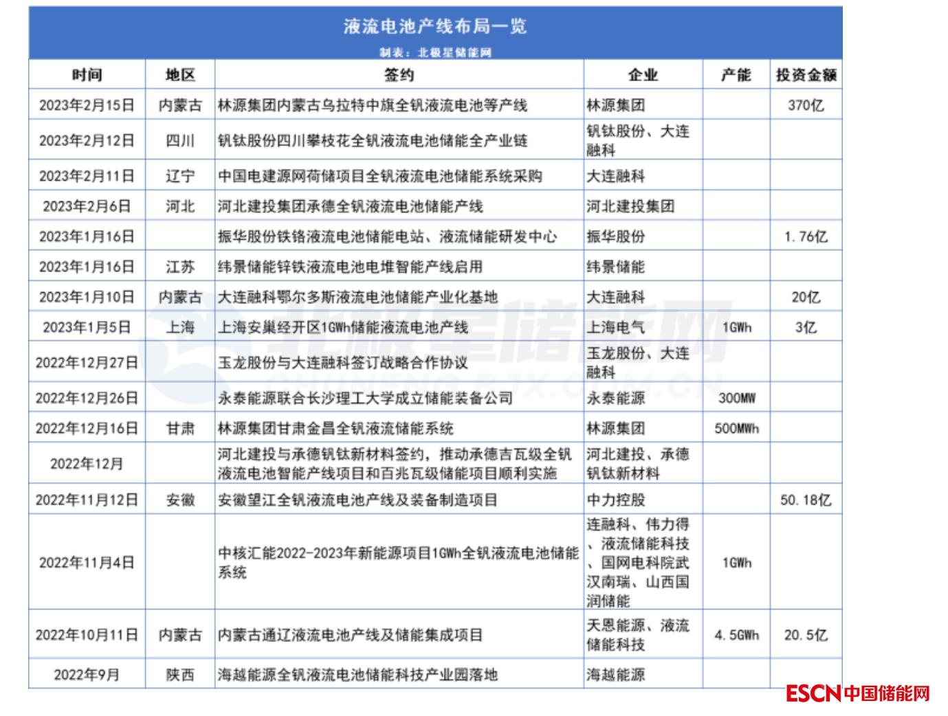 近期越來越多儲能企業(yè)瞄準(zhǔn)全釩液流電池市場,在內(nèi)蒙古、四川攀枝花、甘肅等地簽約投資建設(shè)一批液流電池產(chǎn)線,其中包含林源集團、大連融科、河北建投集團、液流儲能科技、永泰能源等知名企業(yè)。