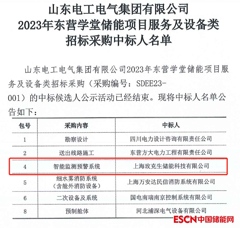 中國儲(chǔ)能網(wǎng)訊:新春起跑,實(shí)干開局!近日,山東電工電氣集團(tuán)有限公司2023年東營學(xué)堂儲(chǔ)能項(xiàng)目服務(wù)及設(shè)備類招標(biāo)采購中標(biāo)人名單公示,美克生能源“智能監(jiān)測預(yù)警系統(tǒng)”成功中標(biāo),詳情如下: