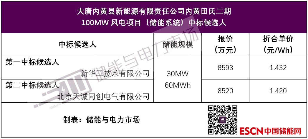 新華三技術(shù)有限公司以總報價8593萬元,折合單價1.432元/Wh,成為第一中標候選人。