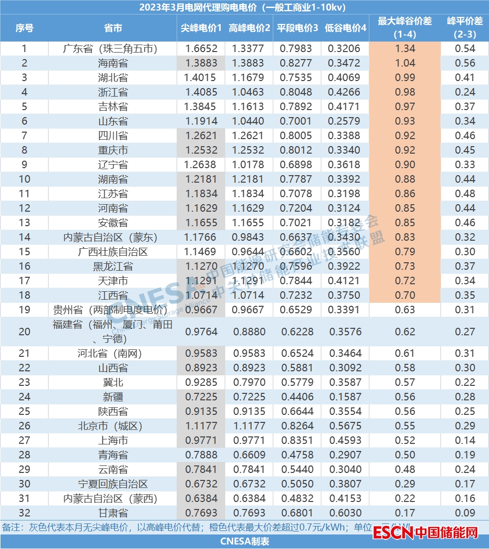 目前,大部分地區(qū)已公布2023年3月電網(wǎng)代購電價(jià),CNESA對(duì)各地一般工商業(yè)10KV的單一制電價(jià)進(jìn)行了匯總測(cè)算?,F(xiàn)有18個(gè)地區(qū)的最大峰谷價(jià)差超過0.7元/kWh,其中廣東?。ㄖ槿俏迨校┖秃D鲜〉淖畲蠓骞葍r(jià)差超過1元/kWh,價(jià)差變化較大的地區(qū)有海南省從2月的0.93元/kWh提高到1.04元/kWh;湖南省從1元/kWh降至0.88元/kWh;河北省南網(wǎng)從0.76元/kWh降至0.61元/kWh,其中,河北省南網(wǎng)3月不執(zhí)行尖峰電價(jià)。另外,甘肅省一直處于價(jià)差低位,本月0.17元/kWh創(chuàng)造電網(wǎng)代購電以來的最低價(jià)差,甘肅作為外送電大省,省內(nèi)電力電量平衡相對(duì)有保障,用電負(fù)荷較平穩(wěn)。
