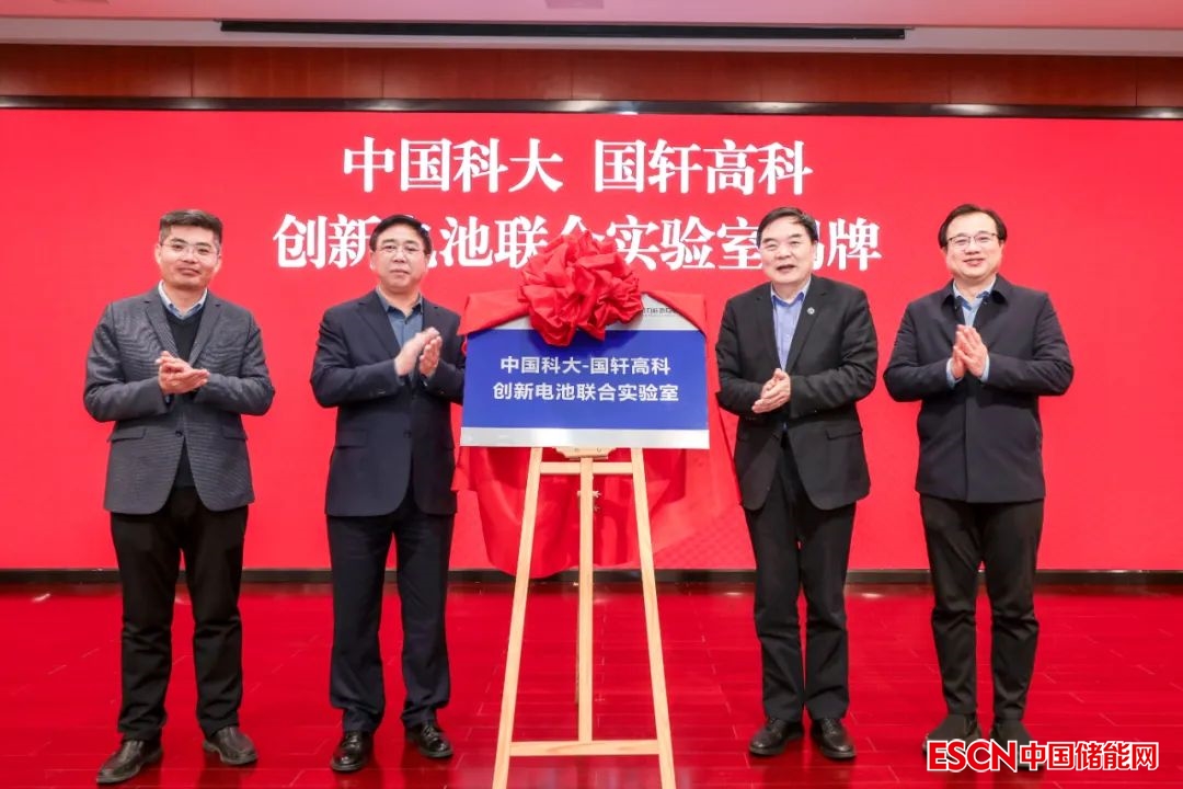中國科大校長包信和(右二)、國軒高科董事長李縝(左二)為創(chuàng)新電池聯(lián)合實驗室揭牌;中國科大黨委常委、副校長傅堯(右一),國軒高科工研總院常務(wù)副院長張宏立(左一)出席儀式