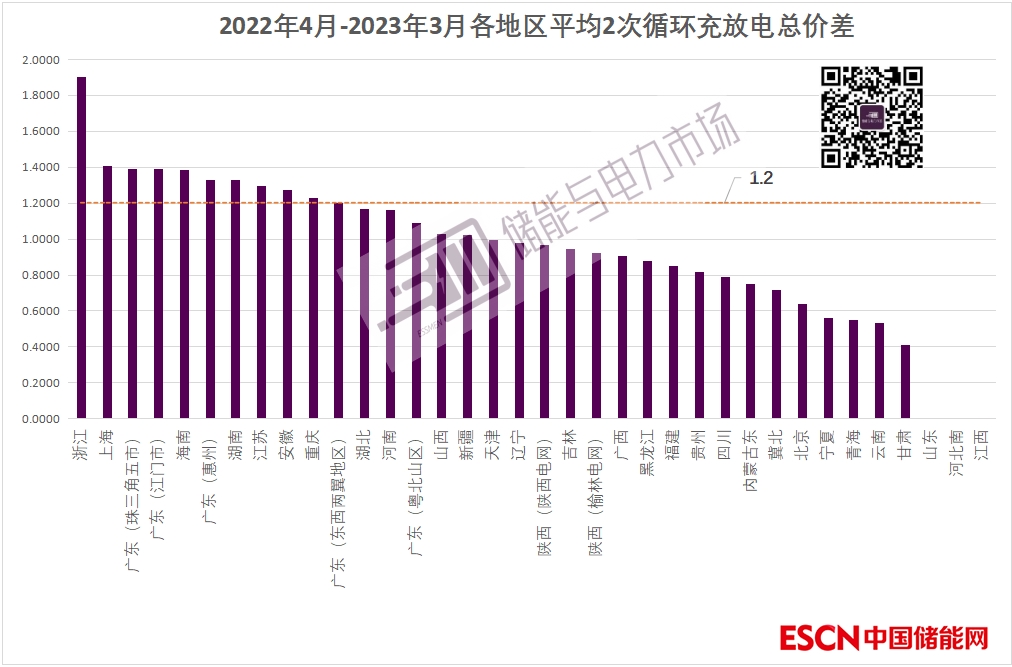 在儲能可實現全天兩次充放電操作的區(qū)域,兩次充放電電價差之和超過1.2元/kWh的區(qū)域為10個(取最近12個月平均值)。浙江全天兩次尖峰低谷循環(huán)總價差1.9024元/kWh,遠超第二名上海的1.4065元/kWh的水平;